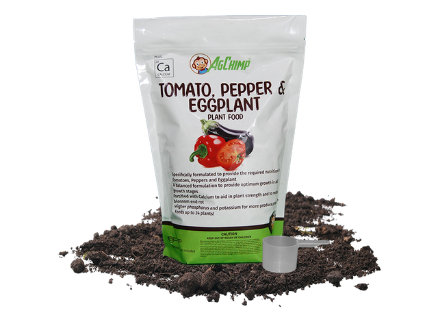 AgChimp Tomato, Pepper, and Eggplant Plant Food is formulated with increased calcium¹ to aid in blossom end rot prevention. AgChimp Tomato, Pepper and Eggplant Plant Food contains slow release nitrogen,